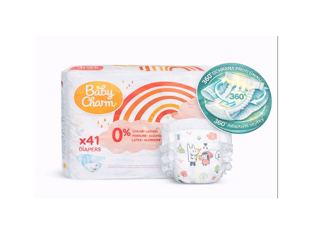 Plenky Baby Charm Super Dry Flex sednou i té nejcitlivější pokožce, takže se nemusíte bát podráždění a opruzenin. Jemný povrch, prodyšný ale savý materiál zajistí pohodlné nošení po celý den i noc. Potěší i potisk s designem z pohádky ,,Červená Karkulka''.