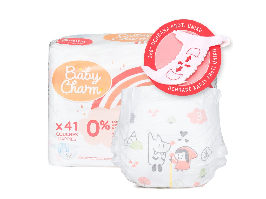 Nebělené plenky Baby Charm Super Dry Flex jsou vhodné i pro citlivou dětskou pokožku. Neobsahují chlór ani parfém a jsou hypoalergenní. Nové 360° pružné vějířky zajišťují spolehlivou ochranu proti protečení i u aktivních dětí. Savé jádro, prodyšný materiál a indikátor vlhkosti udrží zadeček suchý ve dne i v noci. Vhodné pro děti 4–9 kg. Potěší i potisk s designem z pohádky ,,Červená Karkulka''.