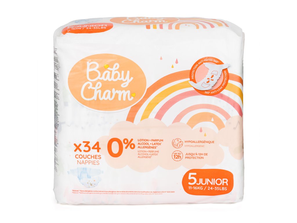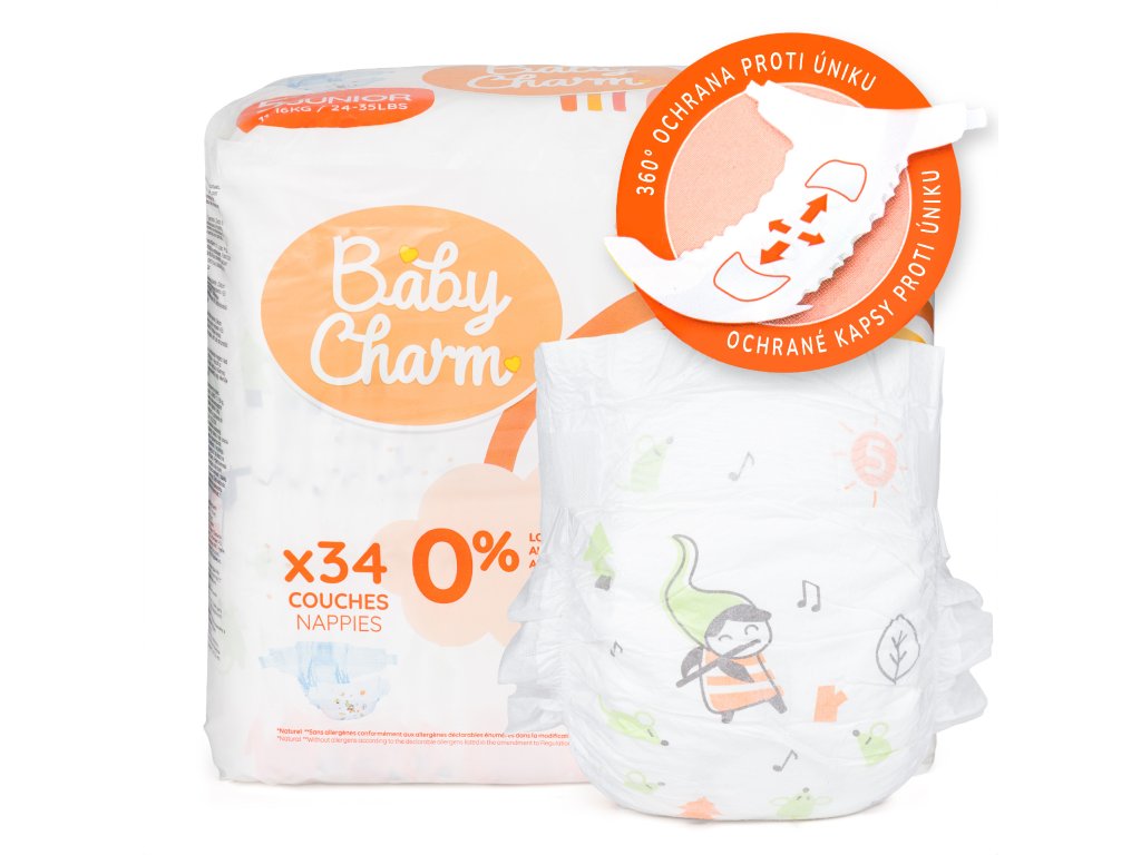 Nebělené plenky Baby Charm Super Dry Flex Junior vyhovují i těm nejcitlivějším dětem. Citlivá pokožka si zaslouží speciální péči bez dráždivých látek, a proto v těchto plenkách nenajdete chlór ani parfém. Jen tak si můžete být jistá, že svému miláčkovi zajistíte maximální pohodlí bez rizika nepříjemné alergické reakce. Plenky Baby Charm díky speciálním materiálům pomáhají eliminovat opruzeniny a zajišťují celodenní úsměv na tváři maminky i dítěte.