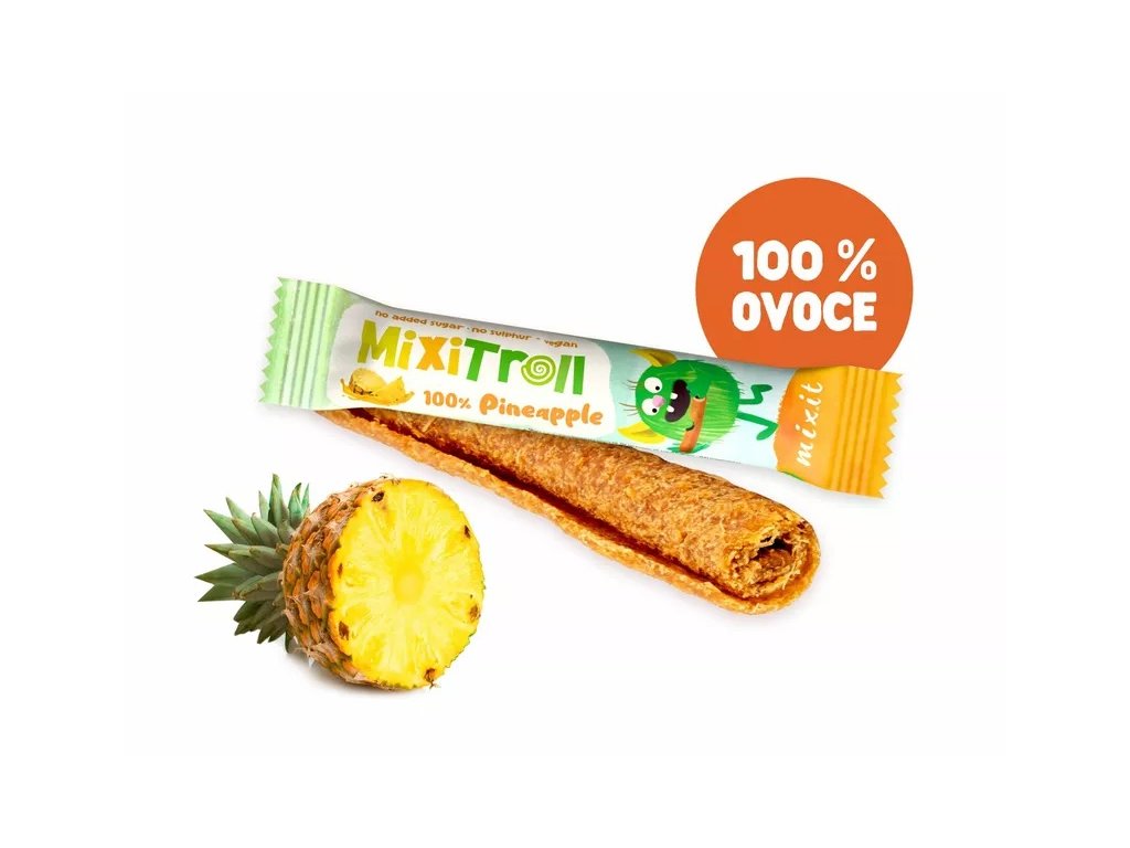 Nechceme Vás vytrolit, tahle dobrota ze 100% ovoce je sladká pravda! Kdo říkal, že ovoce nemůže být zábava? Ochutnejte oblíbený ananas v nové podobě! MixiTroll – Ananas je lahodný a zdravá rolka vyrobená ze 100 % z čerstvého ananasu bez přidaného cukru, barviv a konzervantů. Sladká chuť exotiky, která se vejde do kapsy – ideální jako zdravá svačina na cesty, do práce nebo pro děti do školy. Každá MixiTroll byla vyrobena metodou šetrného sušení při nízké teplotě, takže si zachovala všechny zdraví prospěšné vitamíny a minerály.