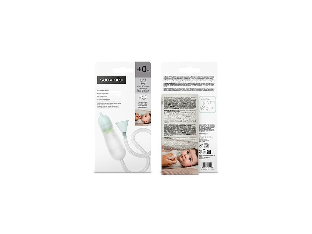 Vložte měkkou špičku anatomické nosní odsávačky Suavinex do nosu dítěte. Vložte náustek do úst a začněte odsávat. Po každém použití vyčistěte odsávačku od zbytků.