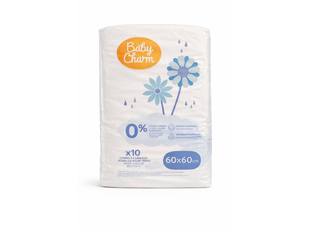 Jednorázové přebalovací podložky Baby Charm 60×60 cm chrání povrch při přebalování doma i na cestách. Měkké, savé a nepropustné, bez parfemace, alkoholu a latexu.